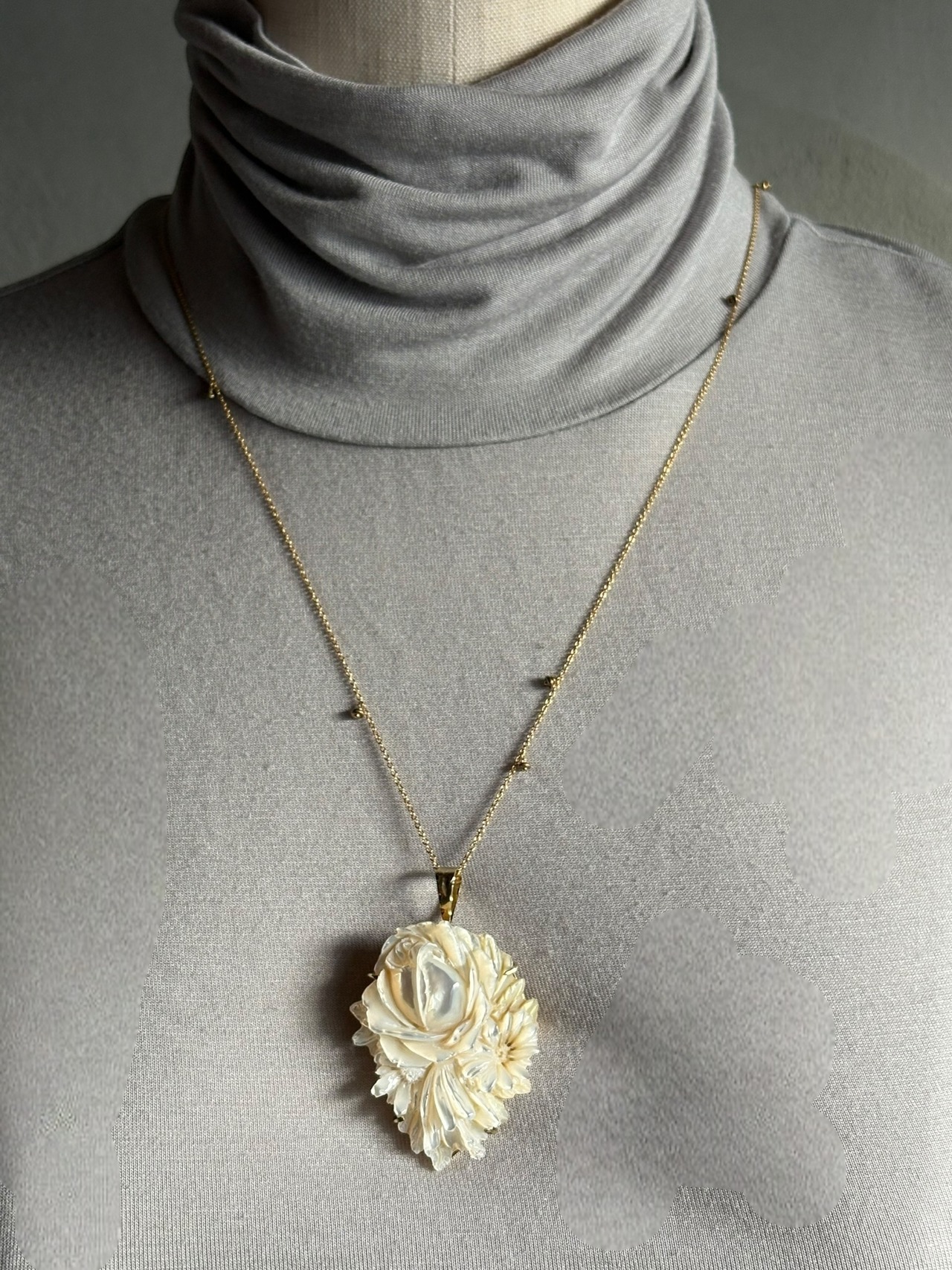 真珠の母貝の美しい照りの部分を彫刻したマザーオブパールのカメオ。